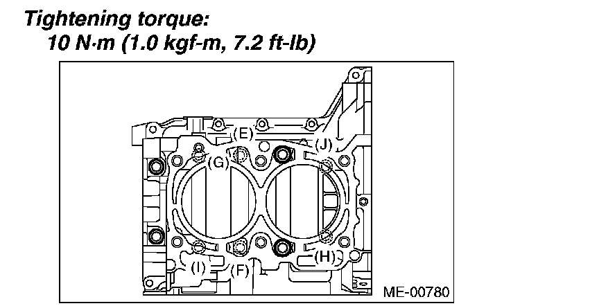 Tighten the 10 mm cylinder block connecting bolts on RH side (E - J) in alphabetical sequence.