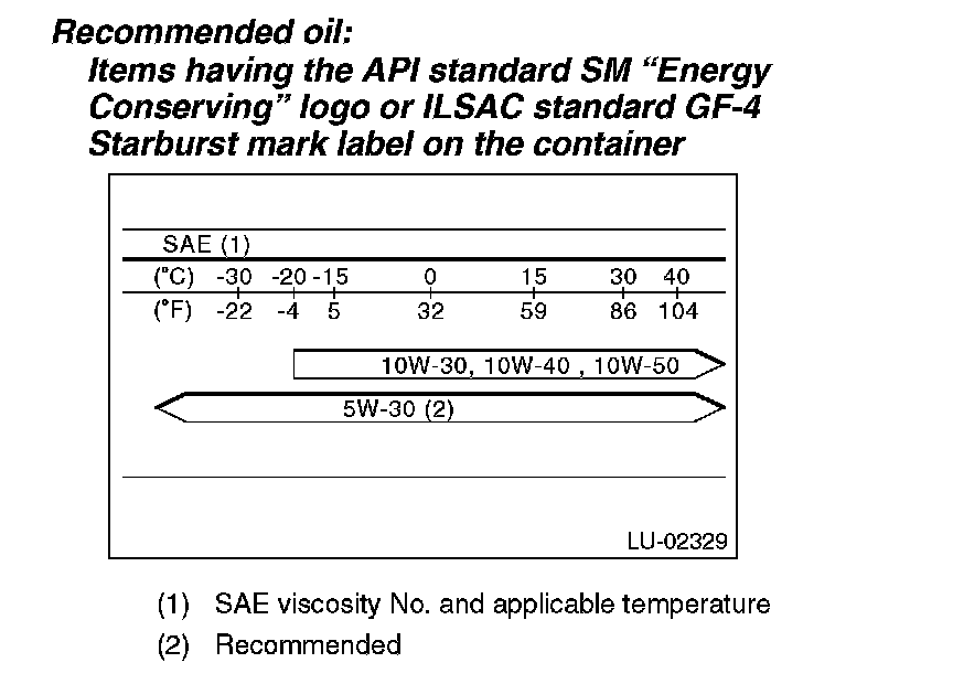 NOTE: If the vehicle is used in regions with high temperatures or in other severe environments, use oil with the viscosities shown below. API standard: SM or SL SAE Viscosity No.: 30, 40, 10W-50, 20W-40, 20W50