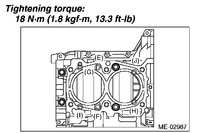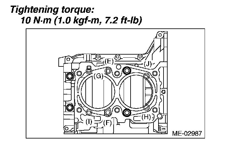 Tighten the RH side cylinder block connecting bolts (E - J) in alphabetical order.