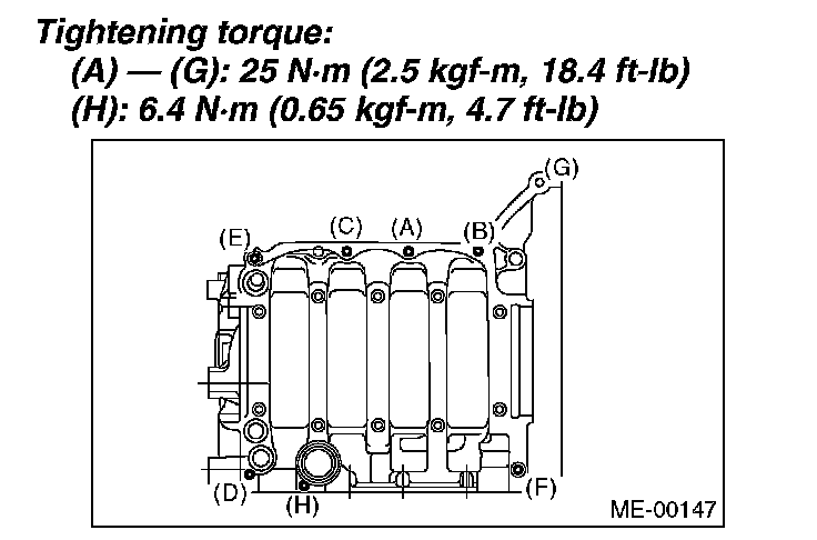 Tighten the 8 mm and 6 mm cylinder block connecting bolts on LH side (A - H) in alphabetical sequence.