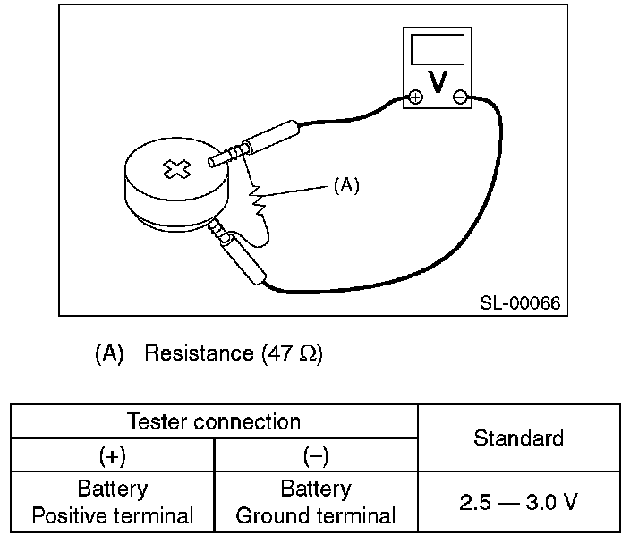 Measure the voltage between the keyless transmitter battery (+) terminal and (-) terminal.