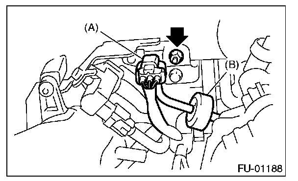 3. Disconnect the connector from manifold absolute pressure sensor (A), and remove the filter assembly (B) from intake manifold.