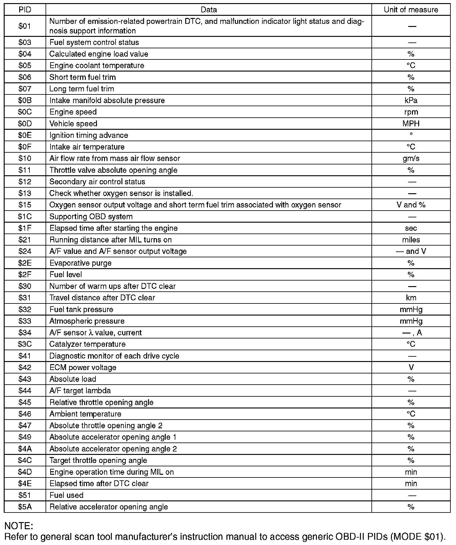 NOTE: Refer to general scan tool manufacturer's instruction manual to access generic OBD-II PIDs (MODE $01).