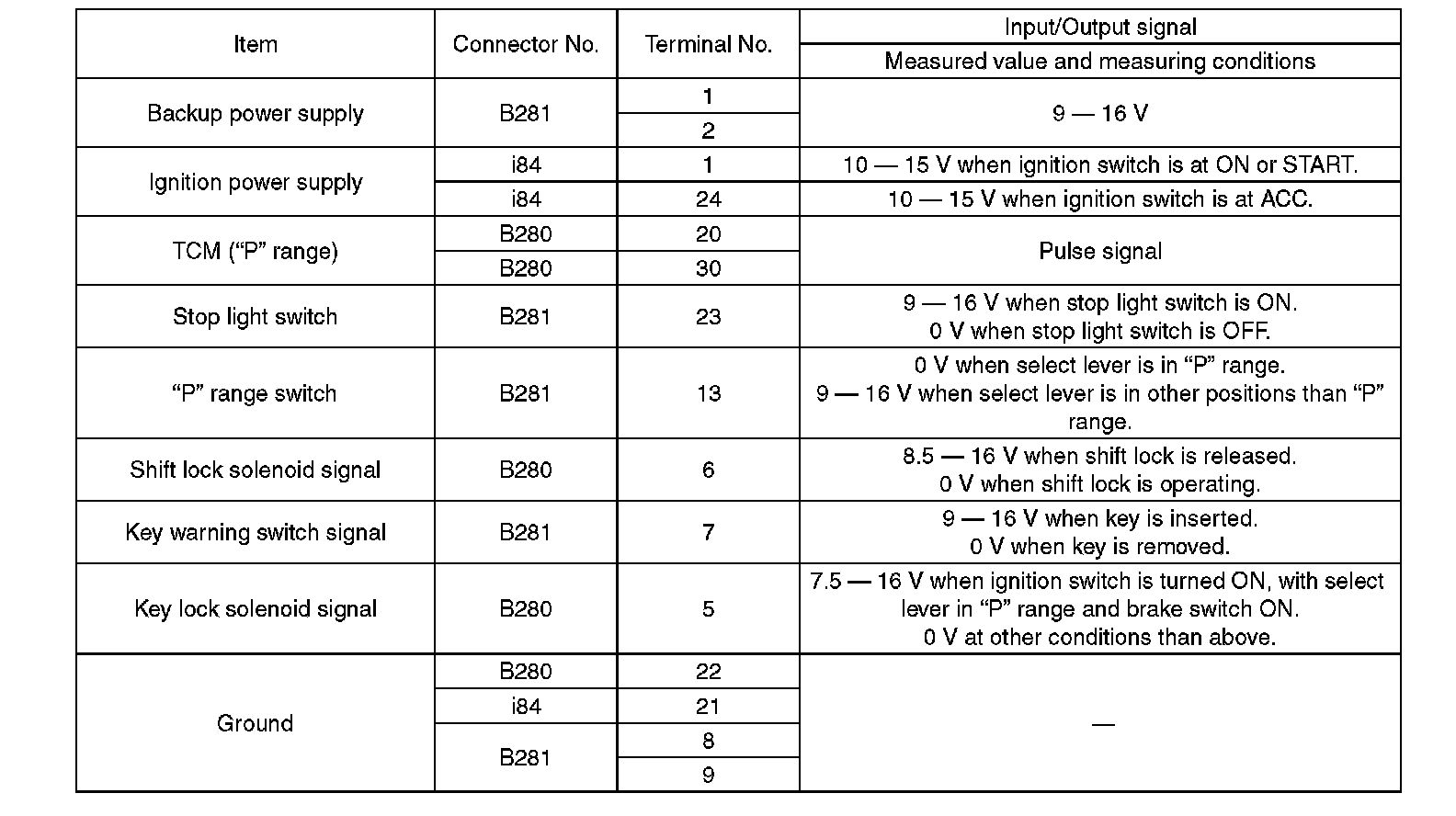 Pinout Values and Diagnostic Parameters