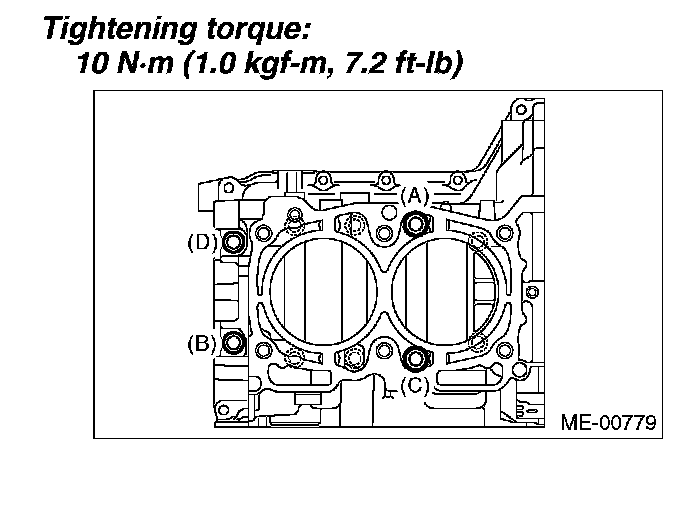 Tighten the 10 mm cylinder block connecting bolts on LH side (A - D) in alphabetical sequence.