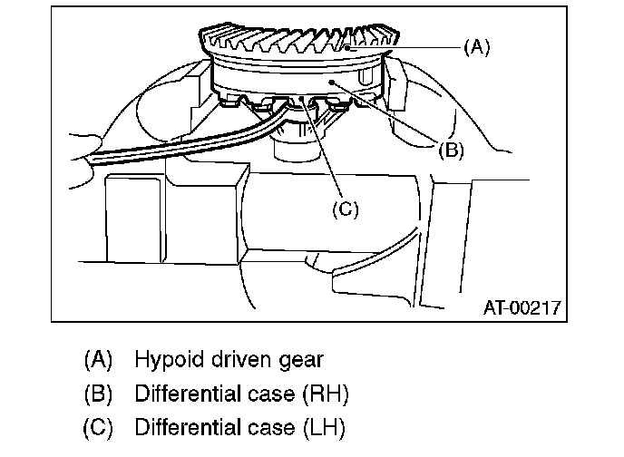 NOTE: Hold the differential case assembly by hand to avoid damaging the retainer mounting hole of the converter case.