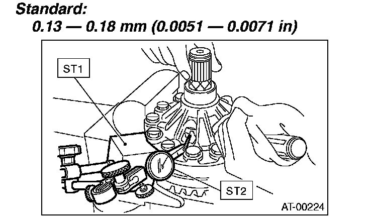 8) Turn the drive pinion several times using ST1, and check to see if the backlash is within the specification using ST2, ST3, ST4 and ST5.