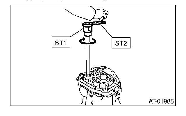 5) Rotate the drive pinion ten times or more using ST1 and ST2.