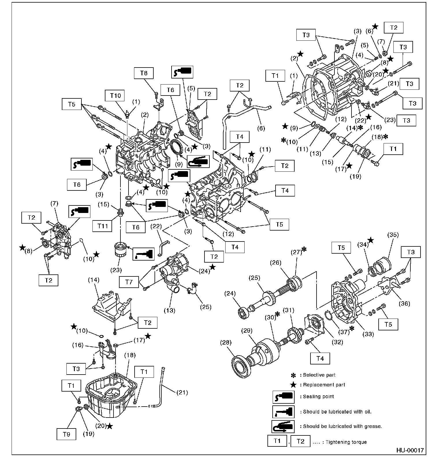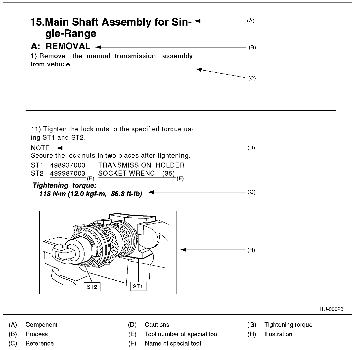 Illustrations are provided for each component. The information necessary for repair work (tightening torque, grease up points, etc.) is described on these illustrations. Information is described using symbol.