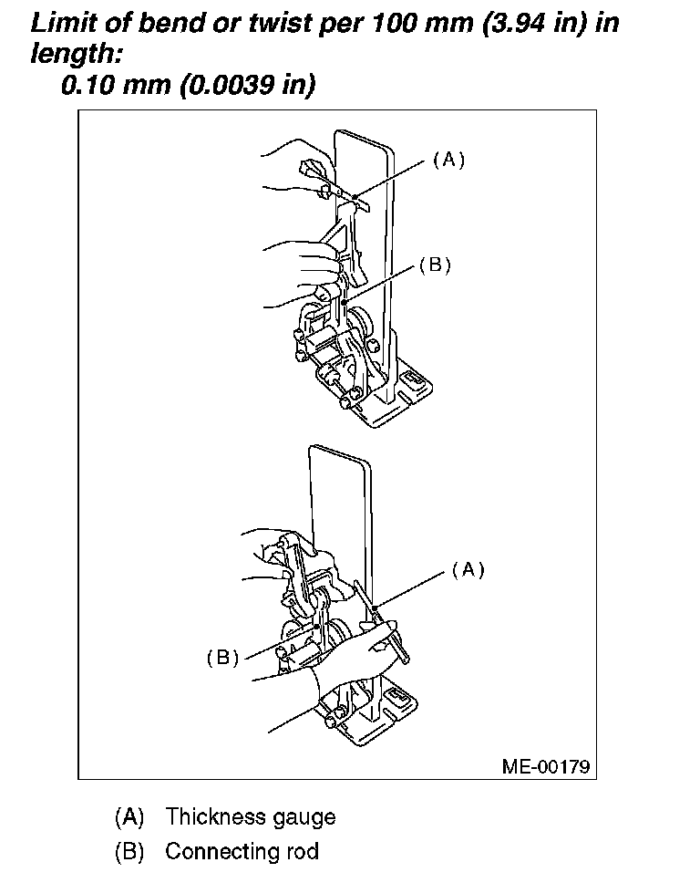 2) Check for bend or twist using a connecting rod aligner. Replace the connecting rod if the bend or twist exceeds the limit.