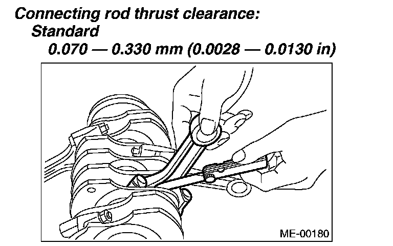 3) Install the connecting rod fitted with bearing to the crankshaft, and measure the thrust clearance using a thickness gauge. If the thrust clearance exceeds the standard or uneven wear is found, replace the connecting rod.