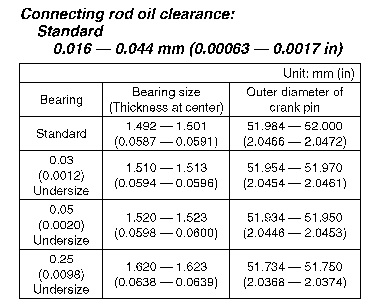 5) Measure the oil clearance on each connecting rod bearing using plastigauge. If any oil clearance is not within the standard, replace the defective bearing with a new part of standard size or undersize as necessary.