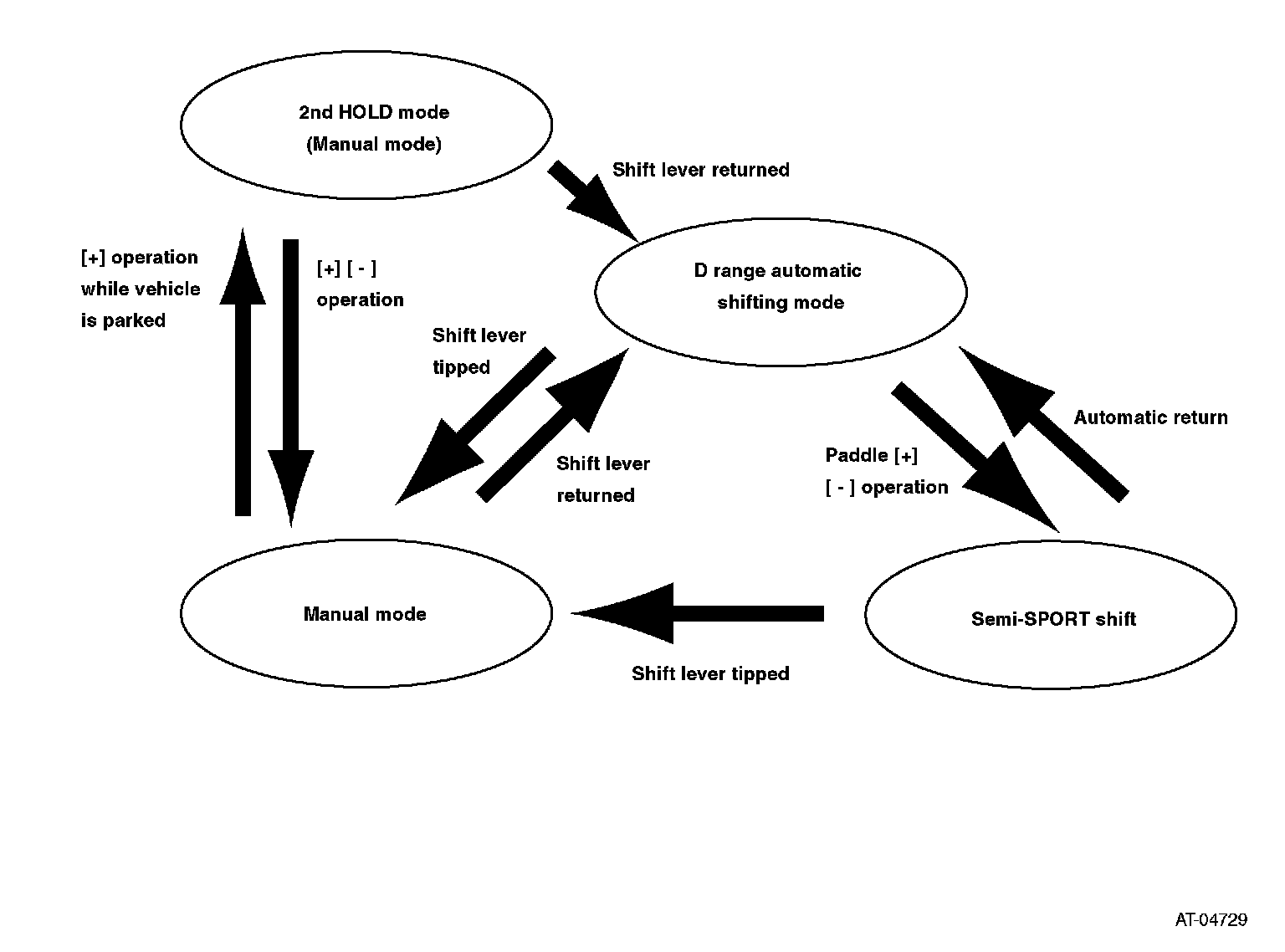Operation of [+] and [-] switches on the paddle in D range can temporarily shift the mode to manual mode, enabling gear shifting with manual operation using paddles. This mode is cancelled under the specified conditions such as linear acceleration status, and the vehicle is automatically returns to D range automatic shifting mode. When ATF oil temperature is extremely high, the semi manual mode is prohibited.