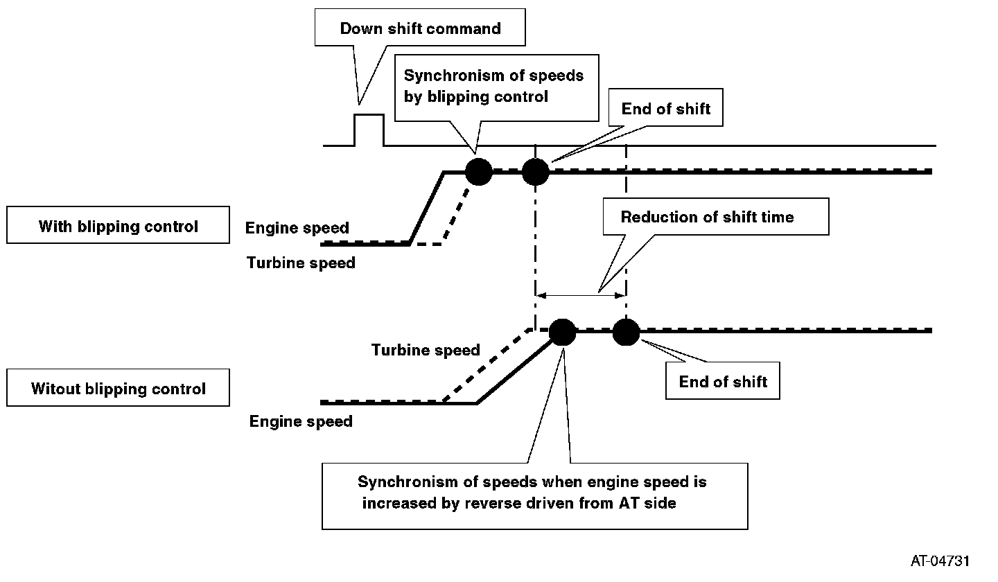 Under the manual mode or semi SPORT shift mode control, if the gear is shifted down manually at a certain vehicle speed or higher with fully closed accelerator, engine speed automatically increases to be close to the level after shifting, which improves shifting response and shifting quality.