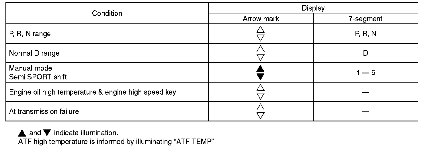 Illumination of indicators on the combination meter are controlled as shown below according to shift pattern change.