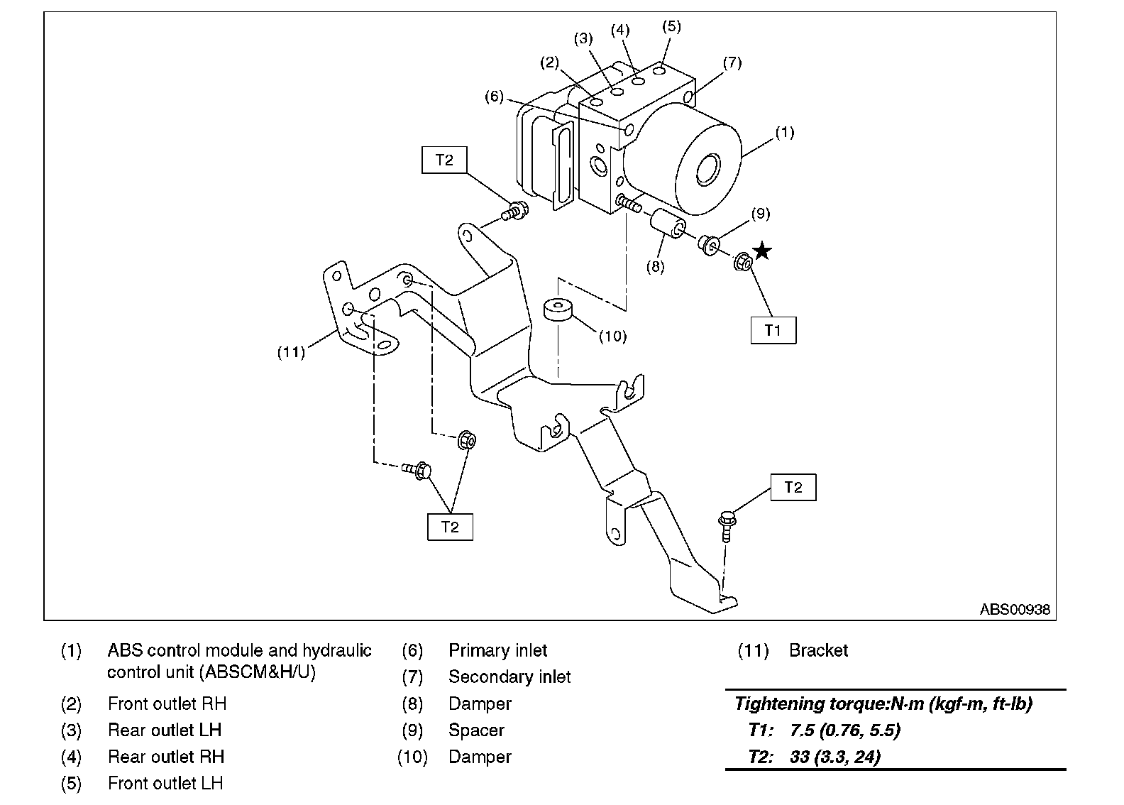 2) Align the damper groove of the ABSCM & H/U to the bracket side claw, and install the ABSCM & H/U with new nuts (Part No. 023506000).
