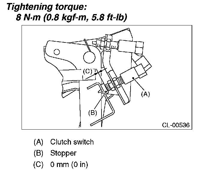 1) Install so that there is a gap of 0 mm (0 in) of the clutch switch and clutch pedal stopper.