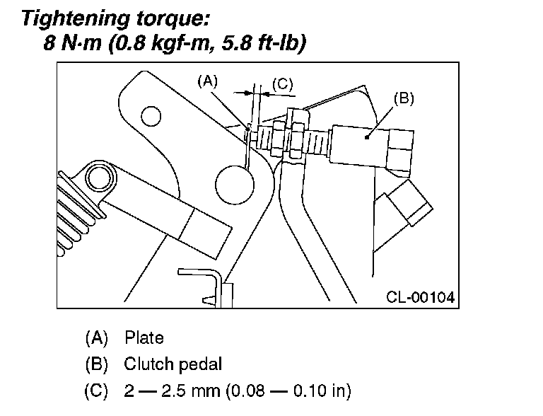 2) Install the clutch pedal plate and clutch pedal so that the gap between them is 2 -2.5 mm (0.08 - 0.10 in), and then tighten the lock nut.