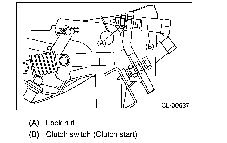 2) Make sure that engine starts with clutch pedal fully depressed. If the engine does not start, adjust the clutch switch and inspect the starter interlock circuit.