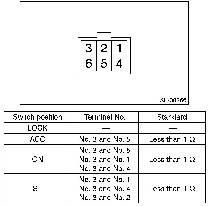 4. Turn the ignition key plate to each position and check the continuity between terminals of ignition connector.