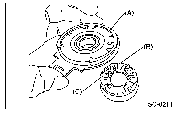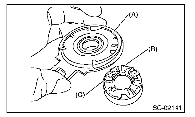 4. Separate the shock absorber bearing (A) from the internal gear (B), and then remove the shock absorber (C).