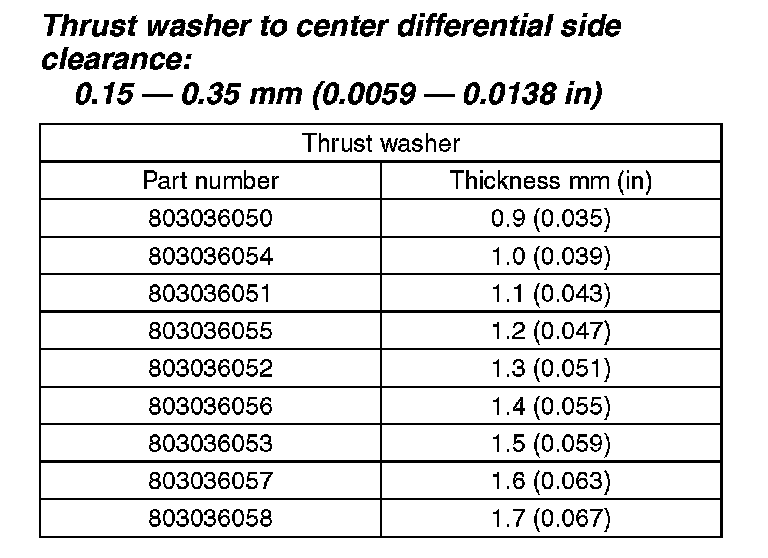Thrust washer to center differential side clearance: 0.15 - 0.35 mm (0.0059 - 0.0138 in)