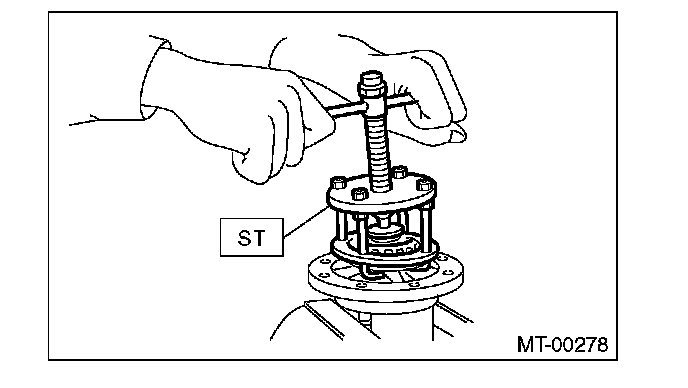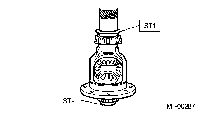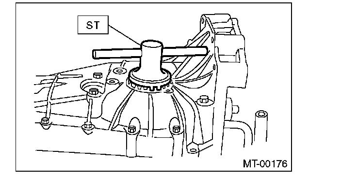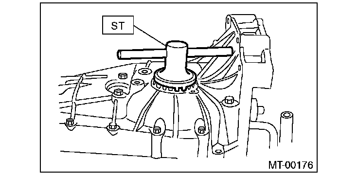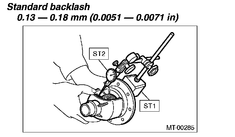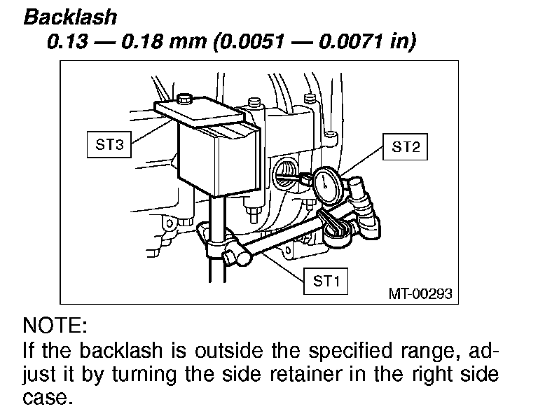 1) Set the ST1, ST2 and ST3. Insert the needle through transmission oil drain plug hole so that the needle comes in contact with the tooth surface on the right corner, and check the backlash.