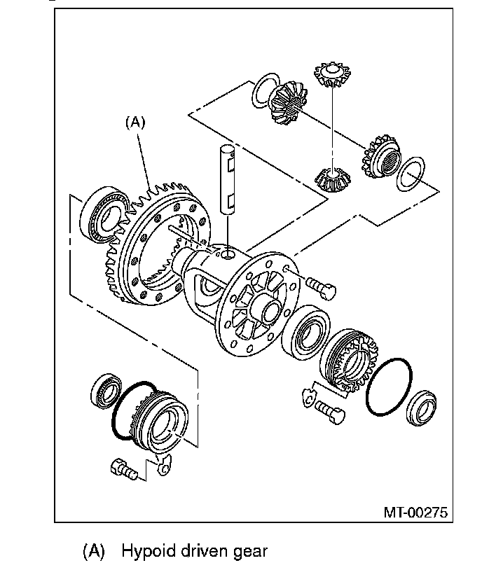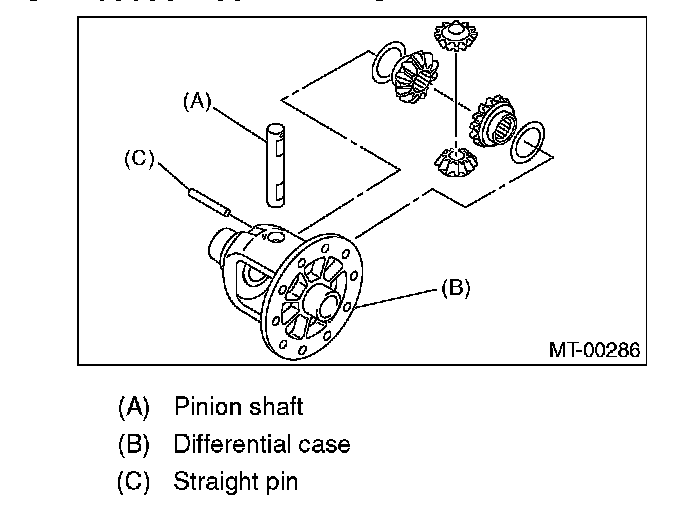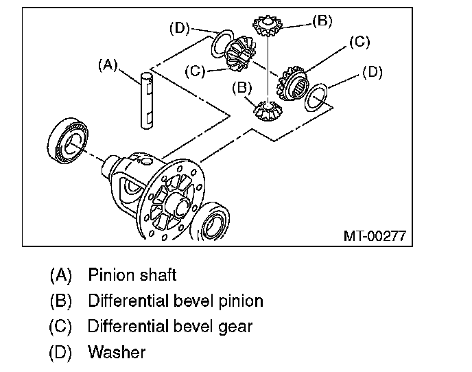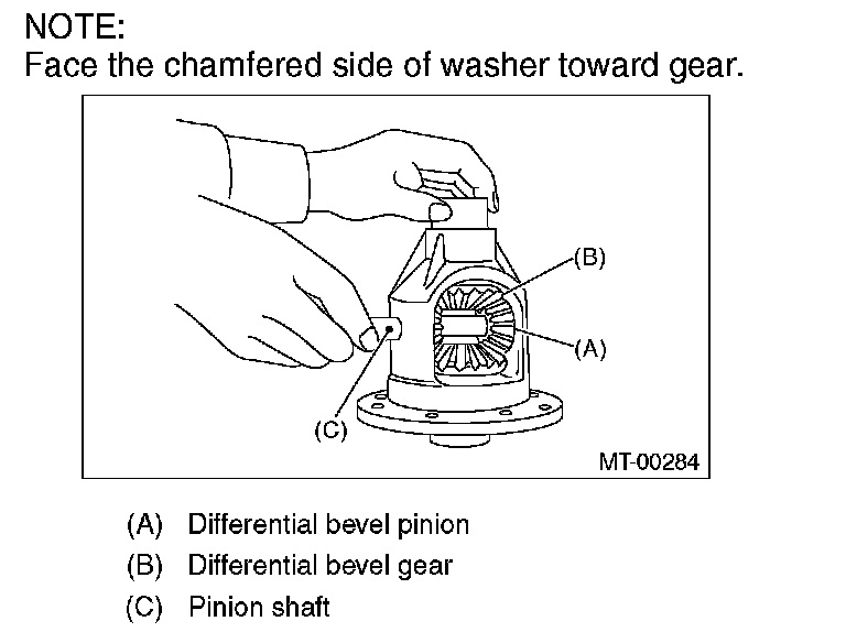 1) Install the differential bevel gear and differential bevel pinion together with washers, and insert the pinion shaft.