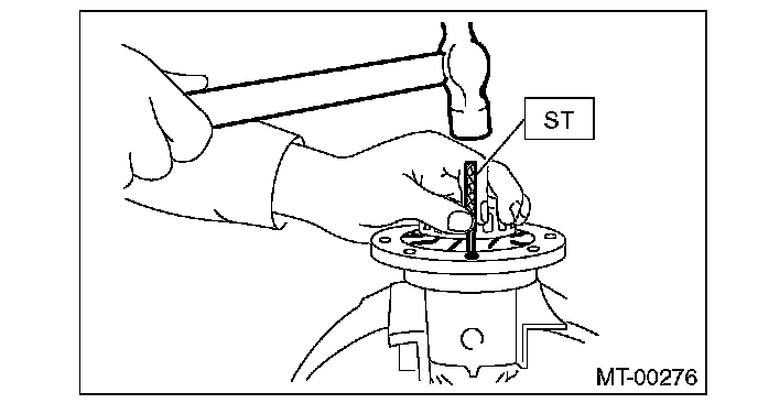 3) Align the pinion shaft and differential case with each hole, and drive the straight pin into the holes from the hypoid driven gear using the ST.