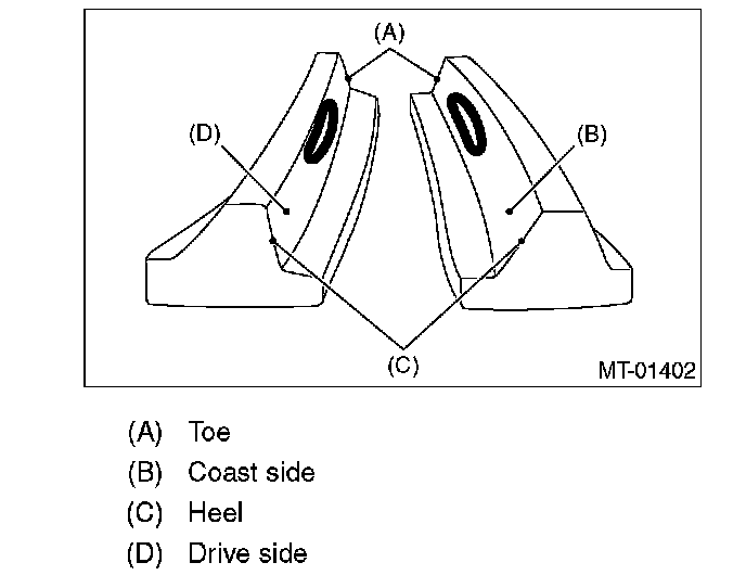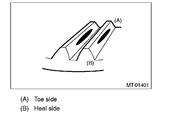Check item: Tooth contact surface is slightly shifted toward the toe side under a no-load condition. (When driving, it moves towards the heel side.)