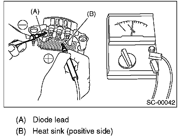 Check for continuity between the negative side heat sink and diode lead. If resistance is 1 ohm or less only in the direction from the heat sink to the diode lead, the negative diode is OK.