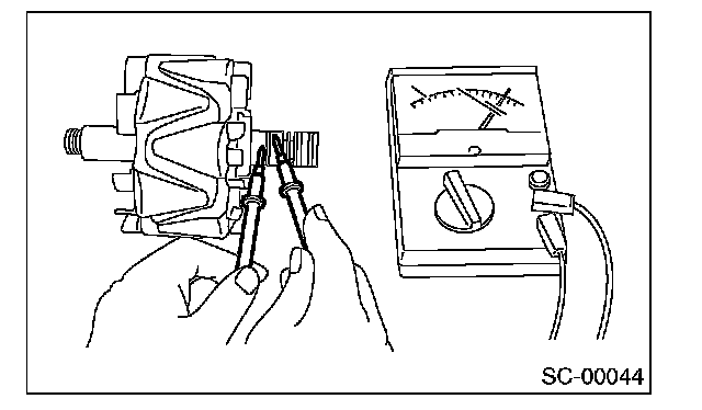 Check the continuity between slip ring and rotor core or shaft. If the resistance is 1 ohm or less, replace the rotor assembly because the rotor coil is grounded.