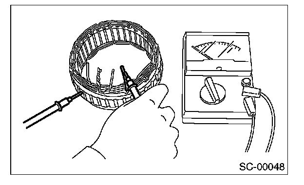 Inspect the continuity between the stator coil stator core and lead wire terminals. If the resistance is 1 ohm or less, the stator coil is grounded. Replace the stator assembly.