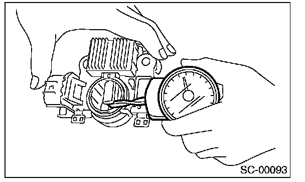 Using a spring pressure indicator, push the brush into the brush holder until its tip protrudes 2 mm (0.08 in). Then measure the pressure of brush spring. If the pressure is 2.2 N (0.224 kgf, 7.91 oz) or less, replace the brush spring with a new one. 4.8 - 6.0 N (0.489 - 0.612 kgf, 17. 26 - 21.58 oz) pressure is required on the new spring.