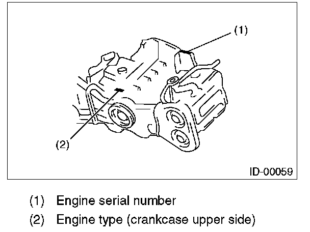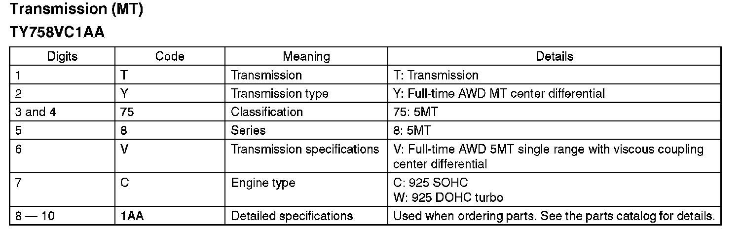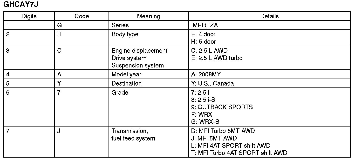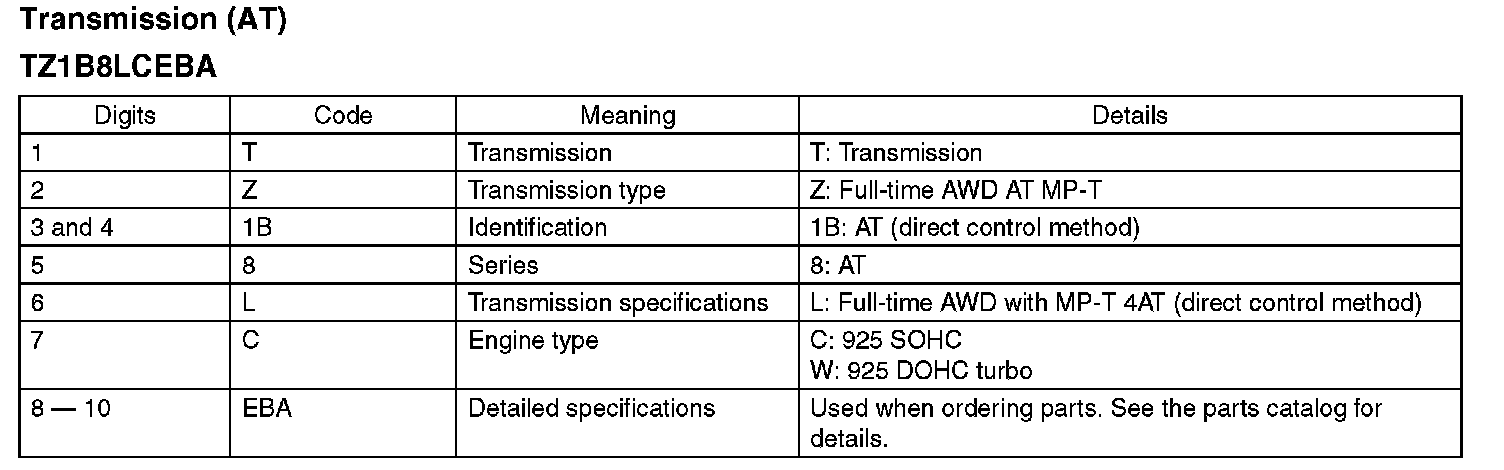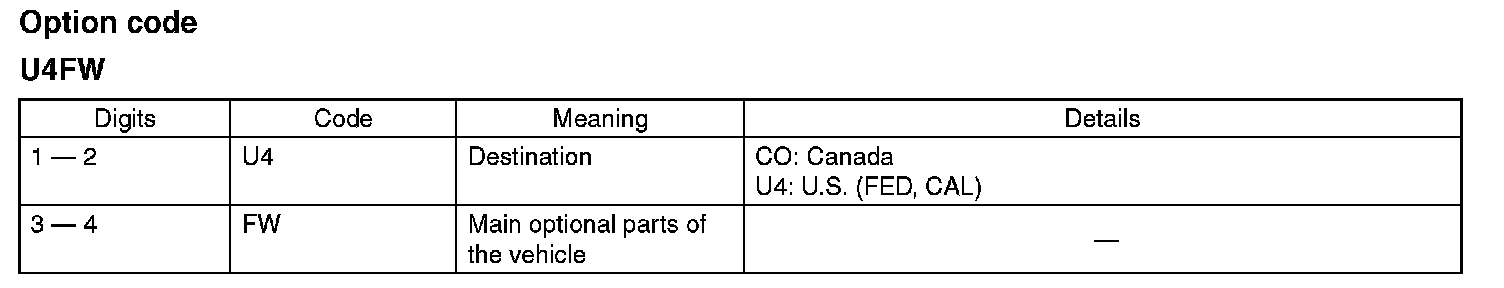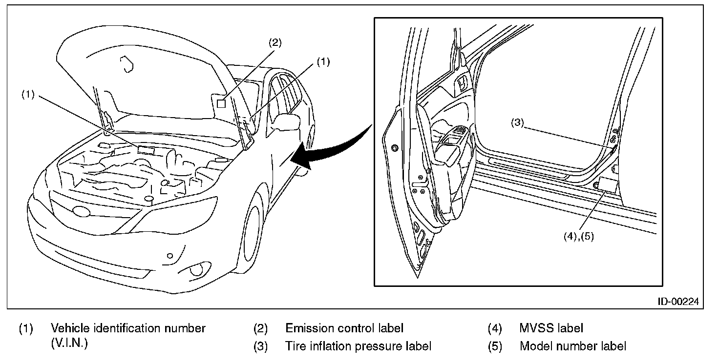 The model number label indicates: the applied model, the option code, the trim code, the engine type, the transmission type, and the exterior color code. This information is helpful when placing orders for parts.