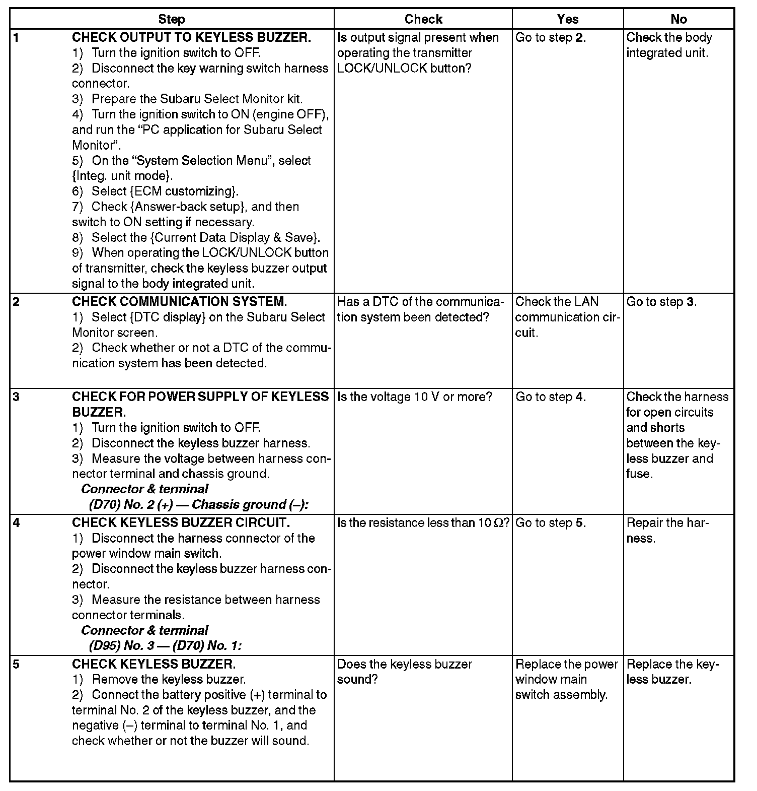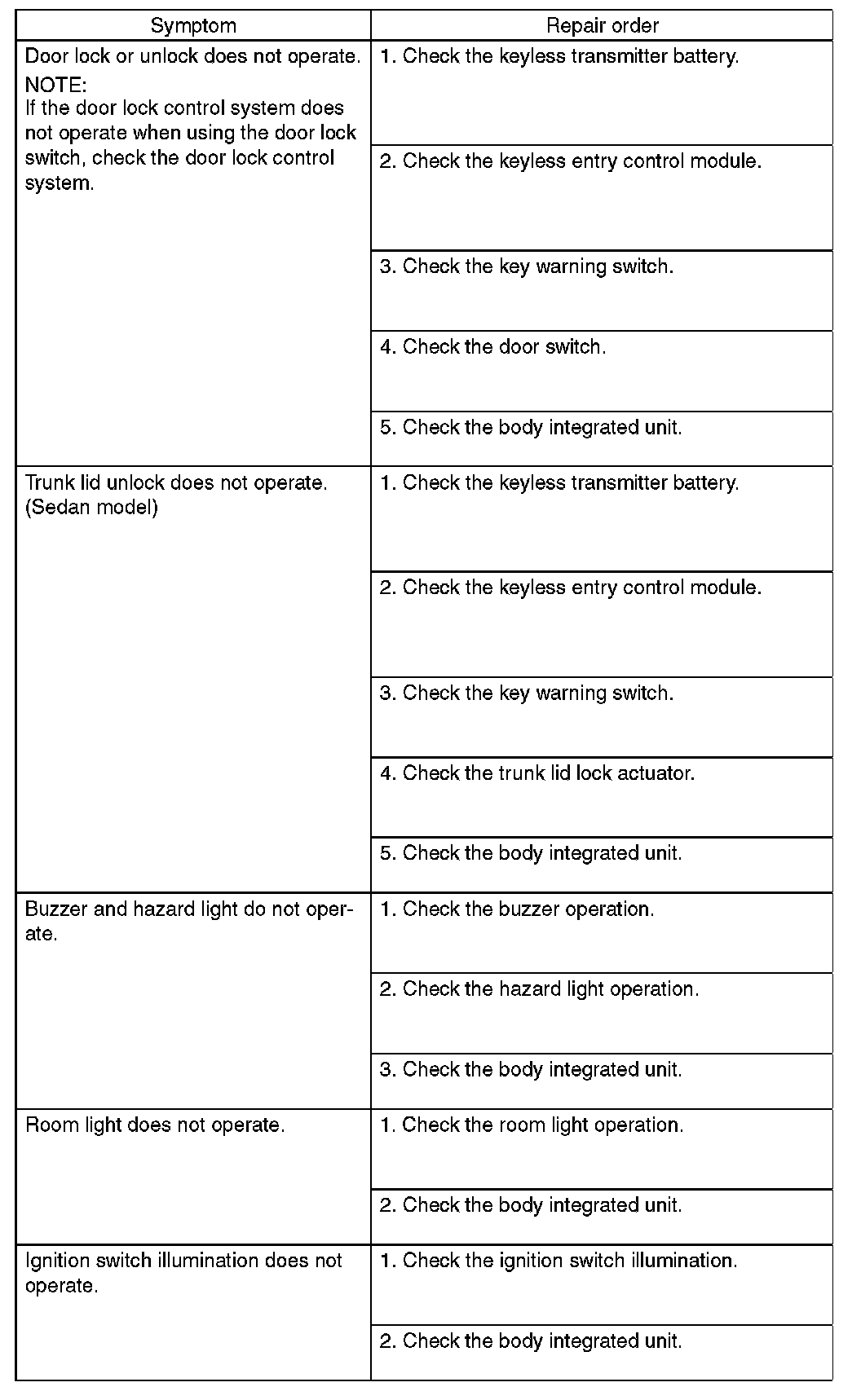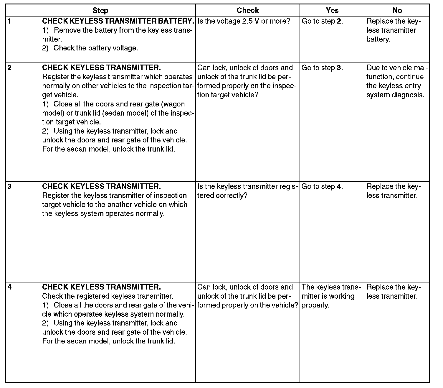 CAUTION: Be sure to reset keyless transmitters from other vehicles that were registered to the inspection target vehicle, and the vehicle to which keyless transmitters were registered for the inspection, to the condition before performing the inspection. (Register the keyless transmitters again.)
