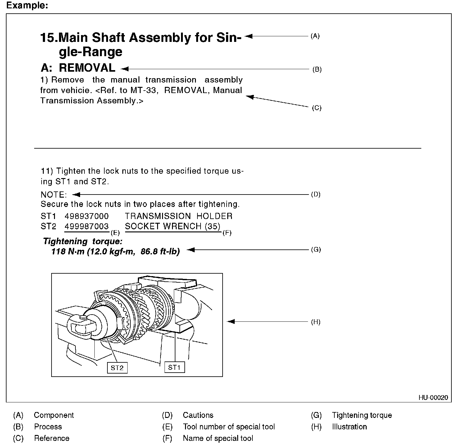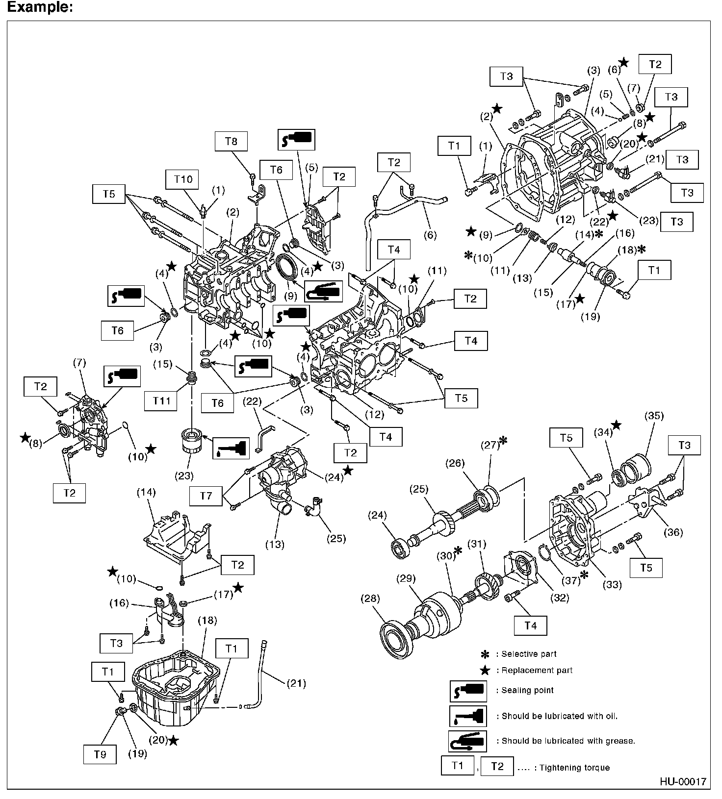 Illustrations are provided for each component. The information necessary for repair work (tightening torque, grease up points, etc.) is described on these illustrations. Information is described using symbol.