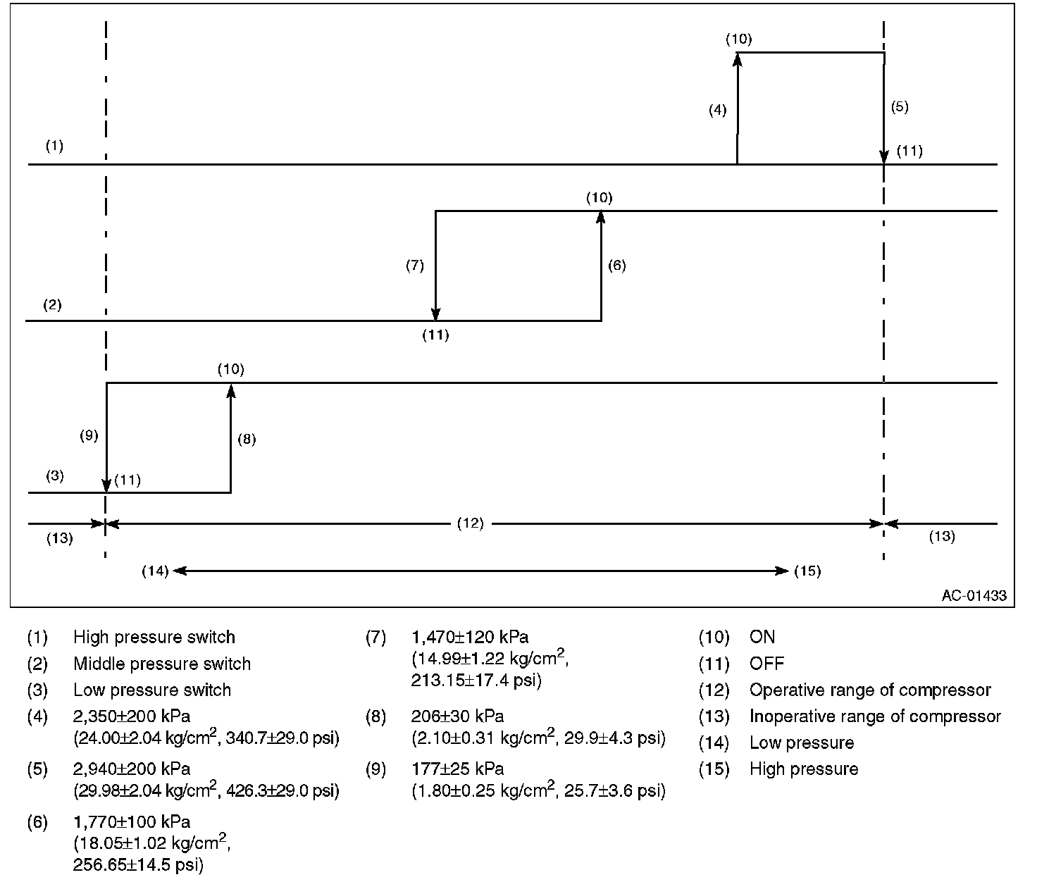 3. Start the air conditioner, and check the operating pressure of switch by turning the compressor (magnet clutch) to ON/OFF. Operation of each switch is as follows.