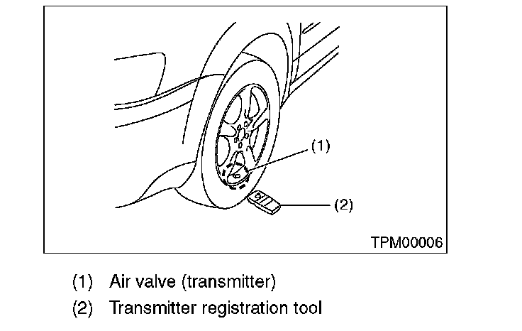 7) Touch the transmitter registration tool to the side wall area near the air valve on the front left tire, and press the switch. The transmitter ID is sent to the tire pressure monitoring control module. (At that time, the tire pressure warning light blinks to confirm that the registration has started.)