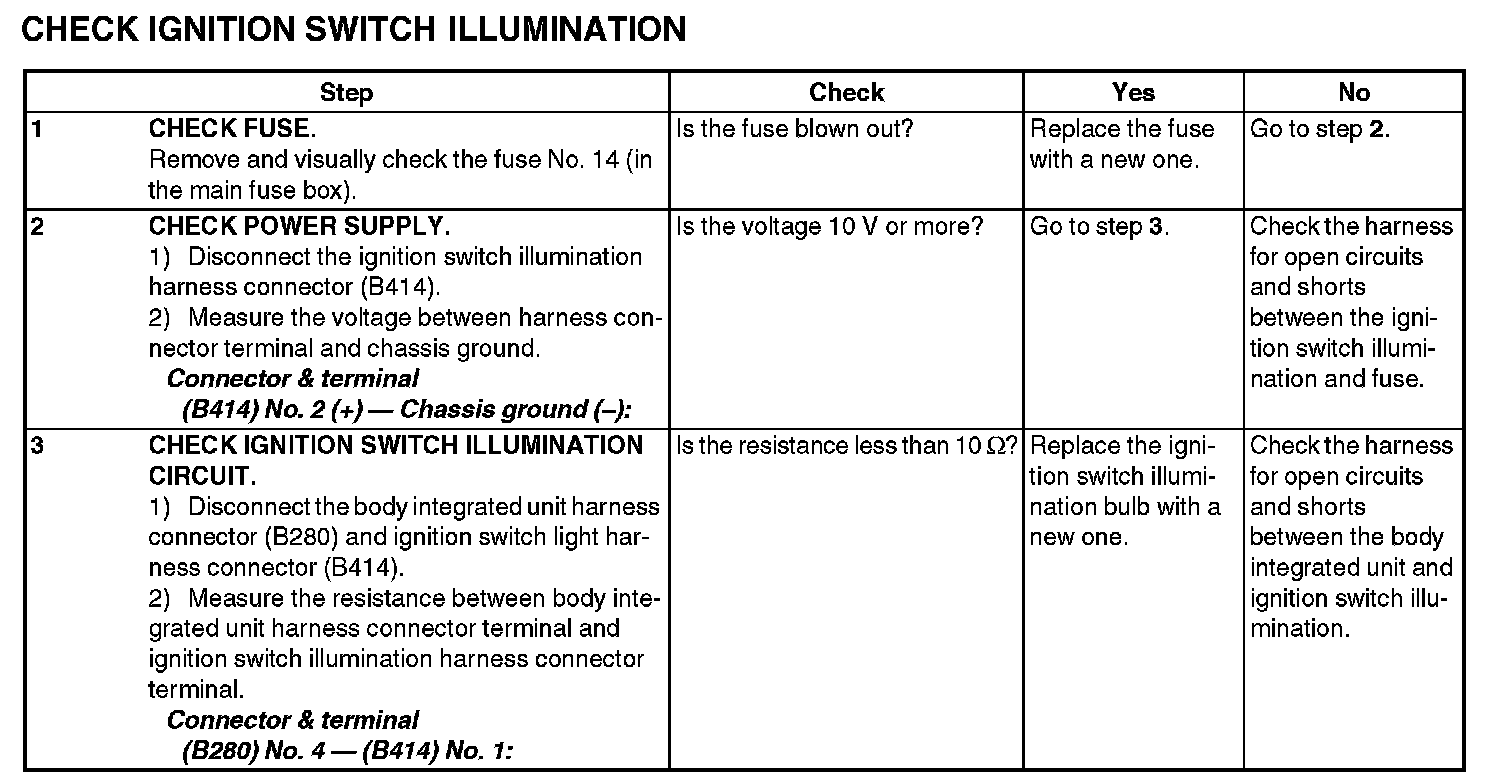 11. CHECK IGNITION SWITCH ILLUMINATION