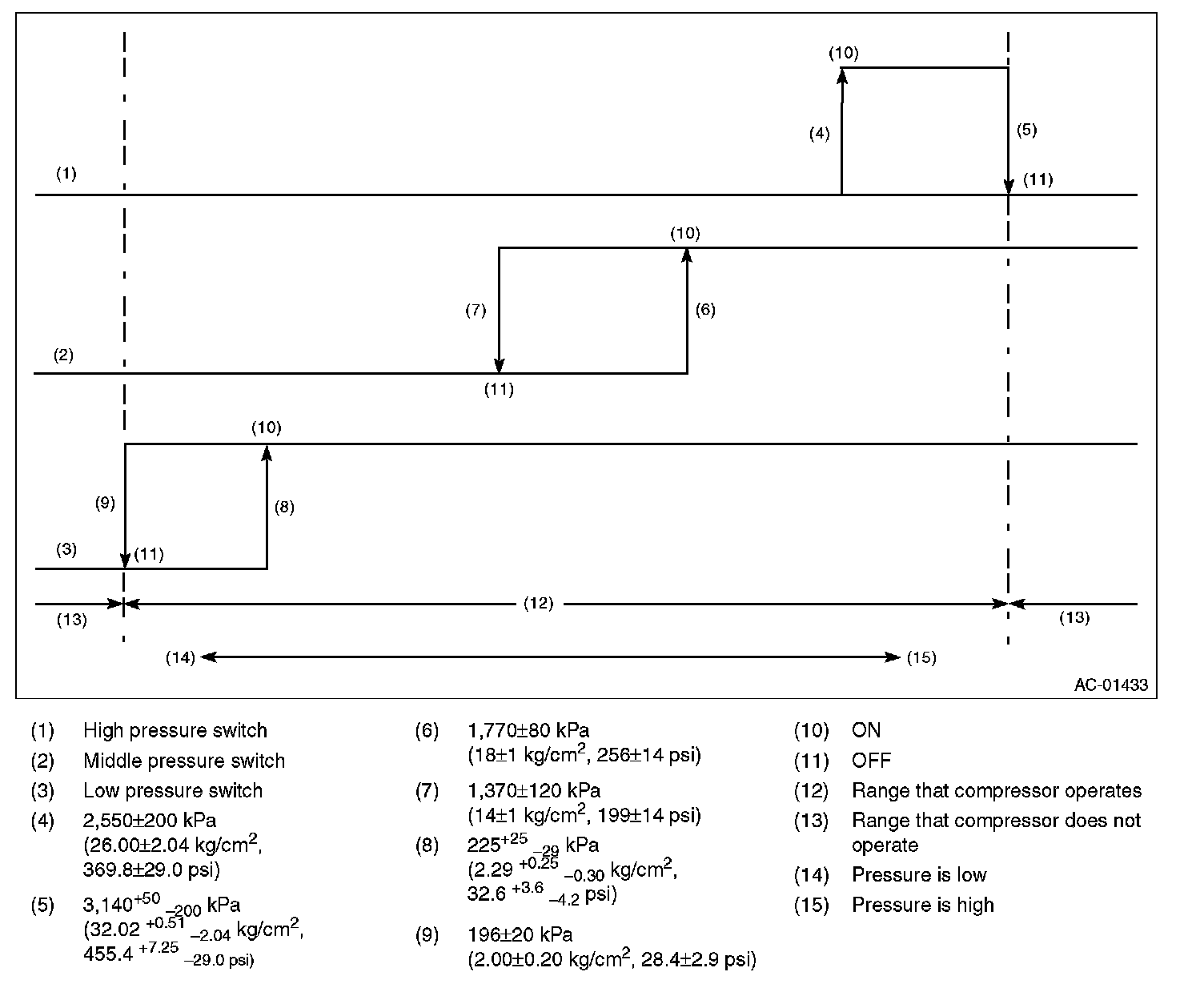 2. Operate the air conditioner, and check the switch operating pressure on ON/OFF in the compressor (magnet clutch). Each switch operates as follows.