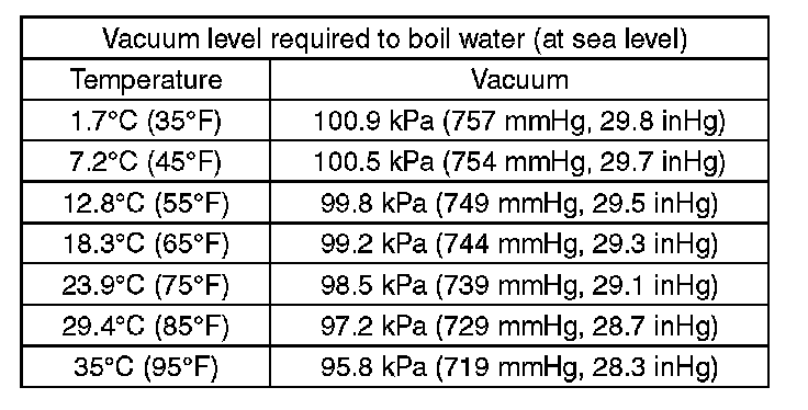 - The list below shows the vacuum values necessary to boil water at various temperatures. In addition, the vacuum levels indicated on the gauge are approx. 3.3 kPa (25 mmHg, 0.98 inHg) lower than those measured at 304.8 m (1,000 ft) above sea level.