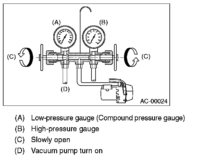 4. Carefully open the valves on the low-/high-pressure sides to activate the vacuum pump.