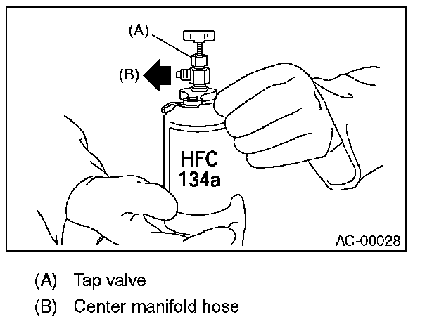 NOTE: When replacing HFC-134a source with a new part, loosen the center hose connection on the manifold gauge set (if applicable, press a purge valve on the manifold gauge set) for a few seconds to discharge the air in the center hose by the refrigerant pressure.