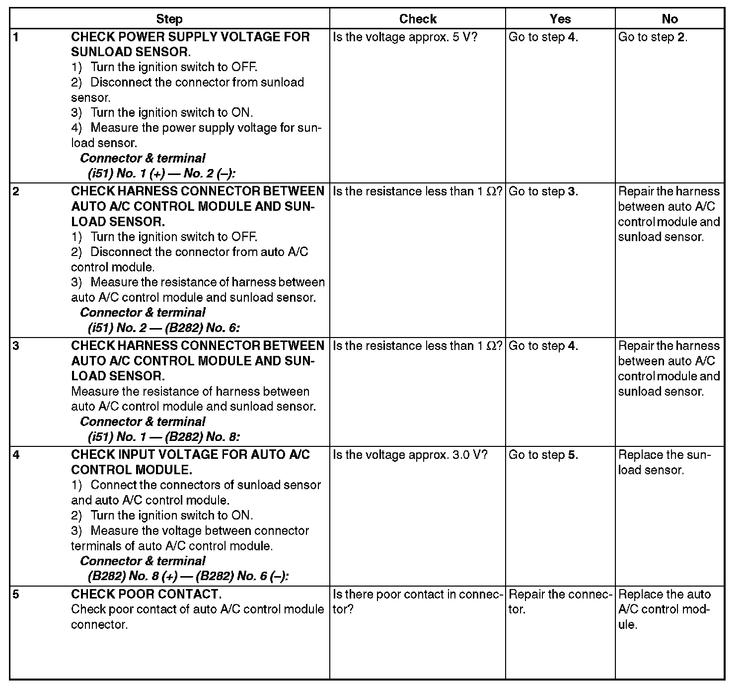 NOTE: When the sunload sensor check is performed indoors or in the shade, it could be diagnosed as having an open circuit. Always check the sunload sensor with the sun shining on it.