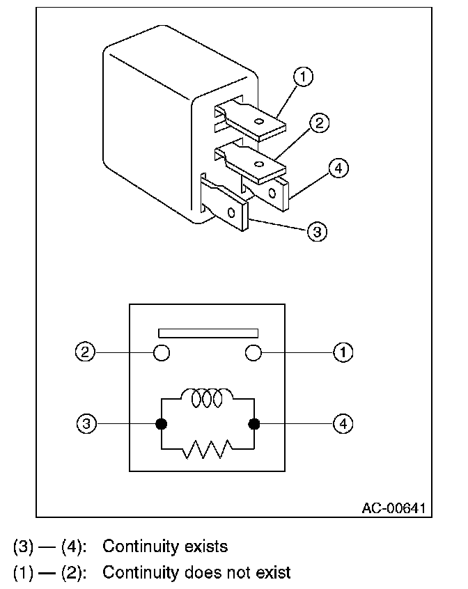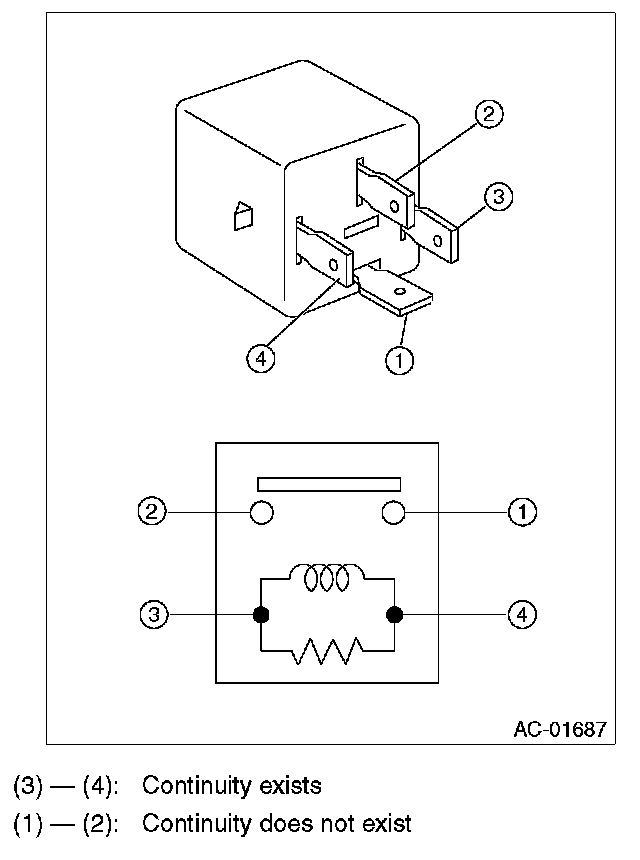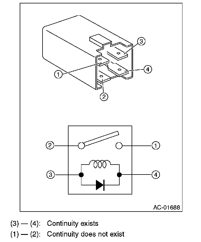 While applying battery voltage to the terminal between (3) and (4), check continuity between (1) and (2). If no continuity exists, replace the relay with a new part.