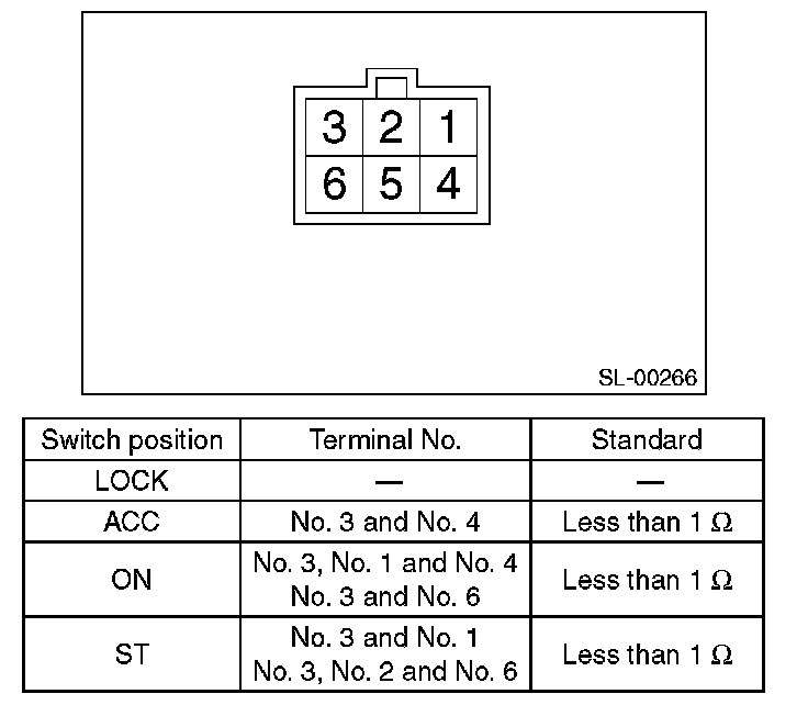4. Turn the ignition key plate to each position and check the continuity between terminals of ignition connector.If NG, replace the ignition switch.