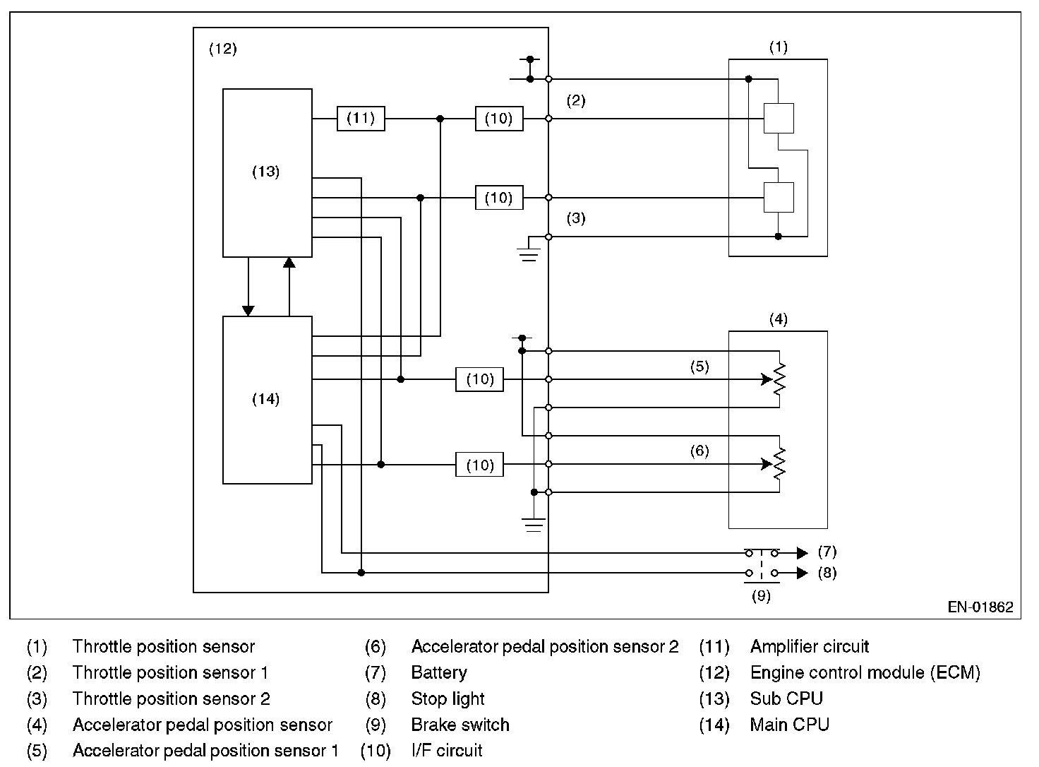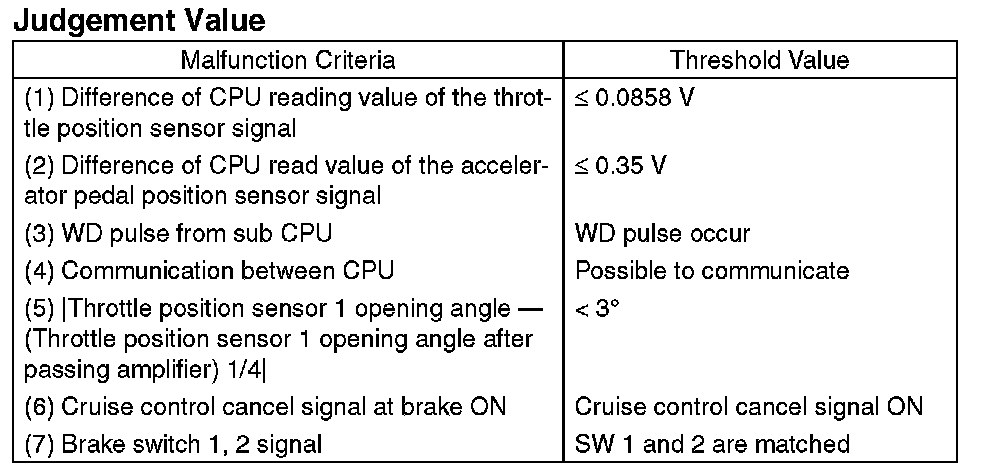 2. When the read value of accelerator pedal position sensor 1 signal is mismatched between main CPU and sub CPU.
