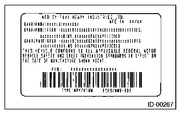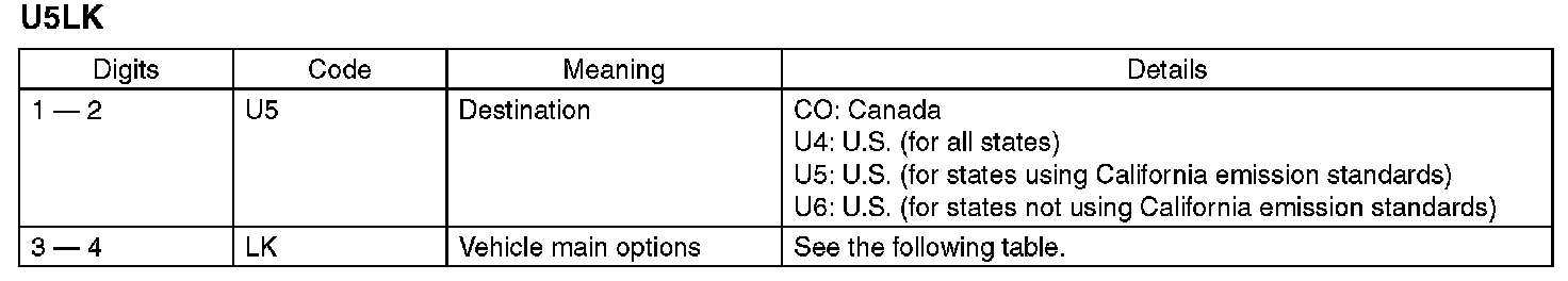 The model number plate indicates: the applied model, the option code, the trim code, the engine type, the transmission type, and the exterior color code. This information is helpful when placing orders for parts.