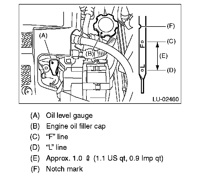 10) After the engine stops, recheck the oil level. If necessary, add engine oil up to the "F" line on oil level gauge.